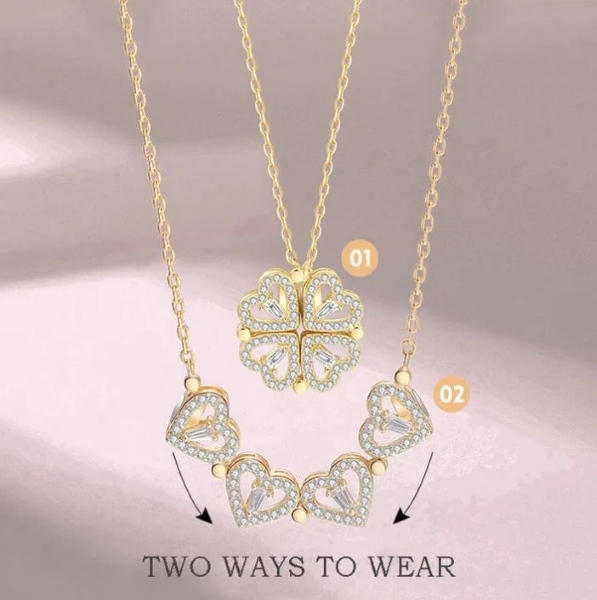 Unsere vergoldete Halskette verwandelt sich leicht von einem vierblättrigen Kleeblatt in eine Reihe von Herzen!