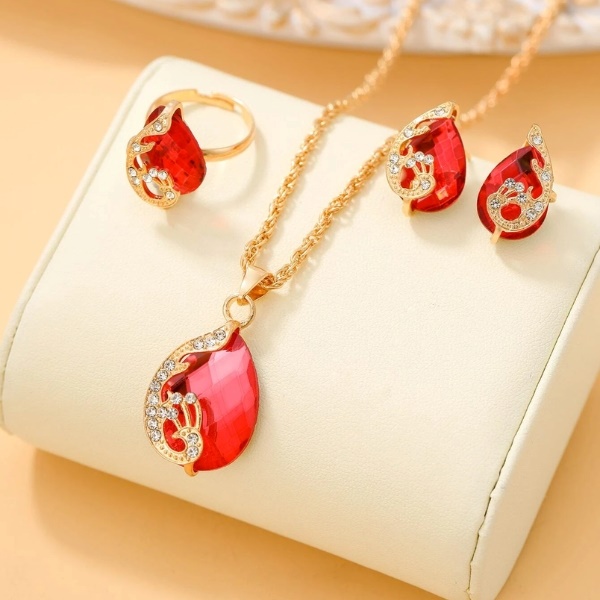 Das elegante Set roter Accessoires umfasst eine Damenuhr, ein Armband, Ohrringe, einen Ring und eine Halskette, alle aus hochwertigen Materialien gefertigt. 🎁
